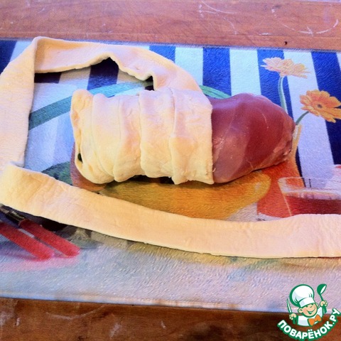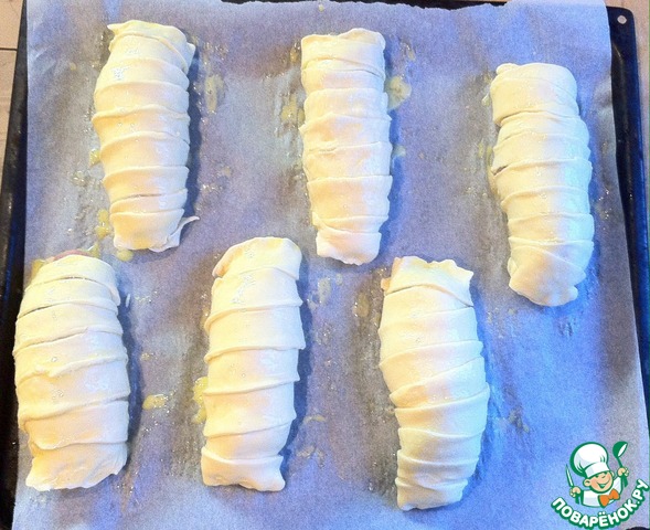 Оборачиваем каждый рулет полоской теста, слегка вытягивая её.