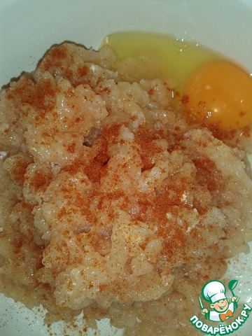 В фарш вбиваем яйцо, добавляем паприку и соль. Тщательно перемешиваем