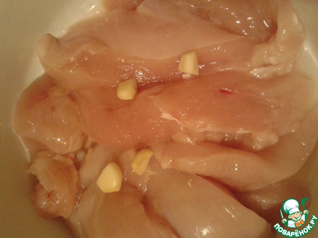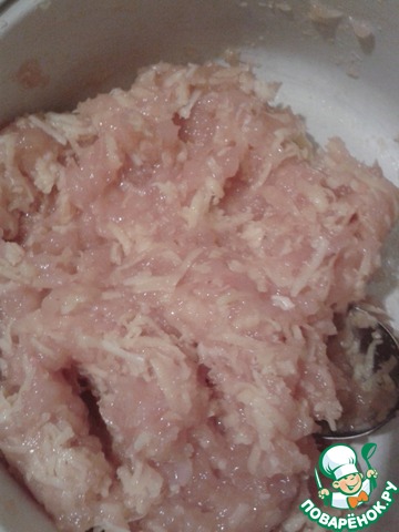 Делаем фарш из филе, порезав мясо кусочками и пропустив через мясорубку. Чеснок я тоже вместе с мясом пропускаю через мясорубку, но можно и потереть или выдавить через чесночницу