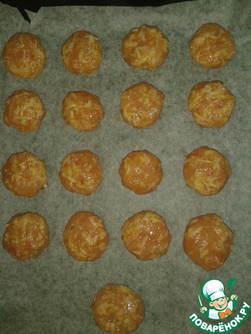 Ставим в предварительно разогретую до 200 градусов духовку на 15 минут. Через 15 минут вынимаем и переворачиваем шарики на другую сторону. Ставим запекаться ещё 15 минут