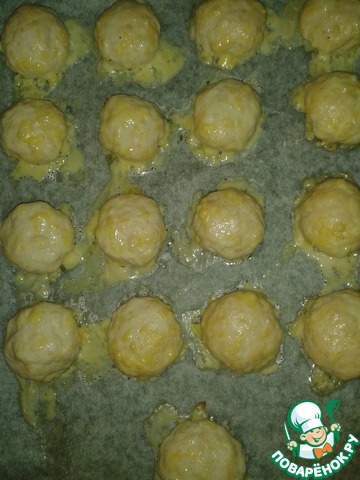 Смазываем форму для выпечки растительным маслом. Я всегда на противень кладу пергамент, чтобы потом с отмыванием его не возиться. Смачивая руки в мисочке с водой, формируем шарики размером в грецкий орех и выкладываем в форму
