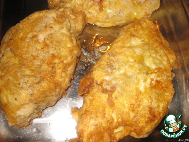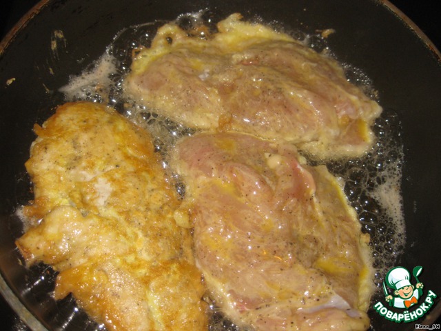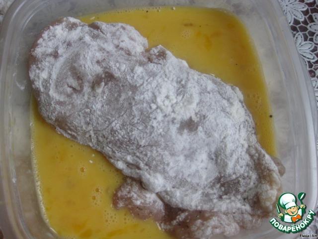 Полученную фаршированную отбивную с двух сторон обвалять в муке, а затем в яйце.