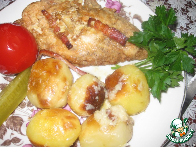 Готовое блюдо выкладываем на тарелку с гарниром. А гарниром у нас была картошечка, запеченная с чесночком и маслом.