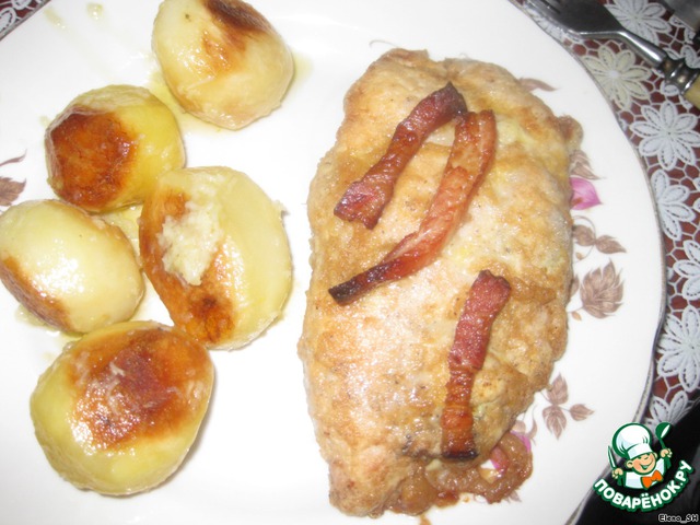 НА край отбивной выложить кусочек копченой грудинки, пластинку шампиньона (я кусочек грибочка для сочности кладу, можно и без него).
