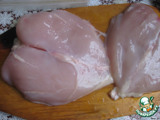По самому толстому краю филе сделать надрез так, чтобы филе развернулось, как книжка, на 2 половинки.