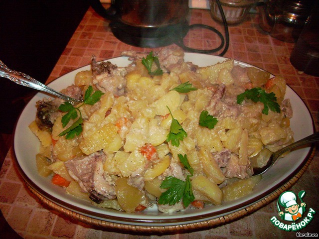 | Это блюдо полюбилось всем домашним и гостям. Получается очень нежная картошечка и сочная курочка!!! И посуда не очень зажаривается! |