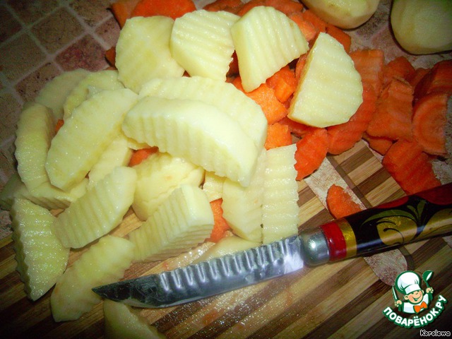 Картофель и морковь нарезаем овощерезкой на средние кусочки.
