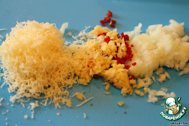 1 луковицу, имбирь, половинку перца чили очень мелко порубить. Добавить тертый пармезан.
