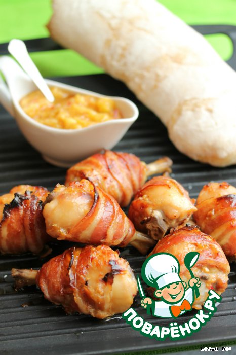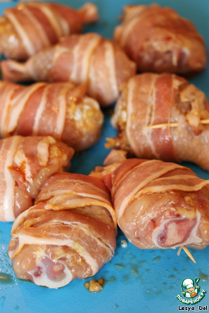 Обернуть каждую ножку беконом и закрепить шпажкой. Разогреть духовку до 200 град. Аккуратно смазать ножки оливковым маслом и запекать 20-25 минут до готовности.