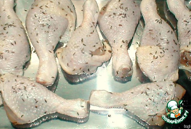 Замариновать куриные окорочка в смеси приправ, добавив немного растительного масла, часа на три.