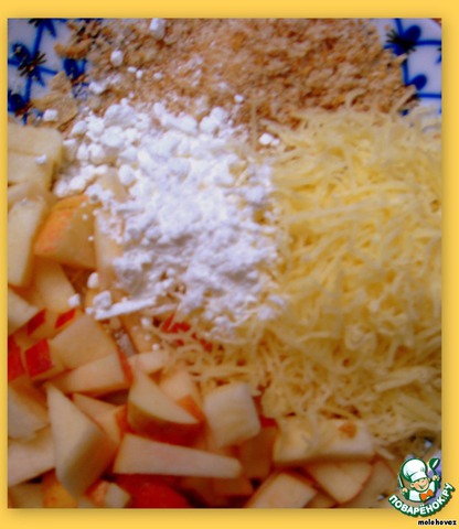 Яблоко нарезать мелкими кубиками, добавить к нему большую часть сыра, чайную ложку крахмала и 2 ложки тертых сухарей.