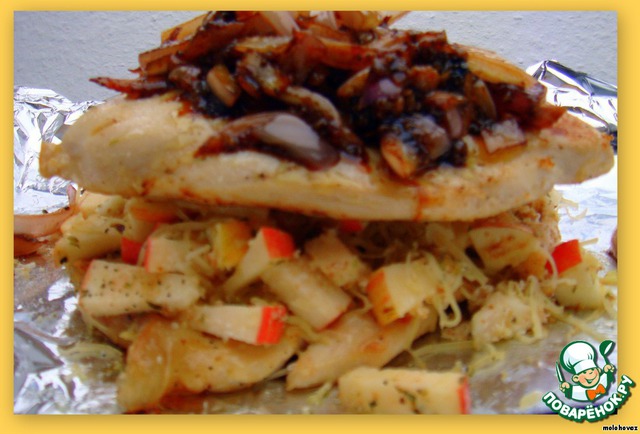 Куриные грудки с начинкой из яблок, сыра и карамелизированного лука