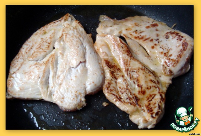 Отбитые грудки выложить на раскаленную сковородку и быстро обжарить на ложке оливкового масла по 1-2 мин с каждой стороны, только чтобы они зарумянились. Снять со сковородки и отложить в сторону.