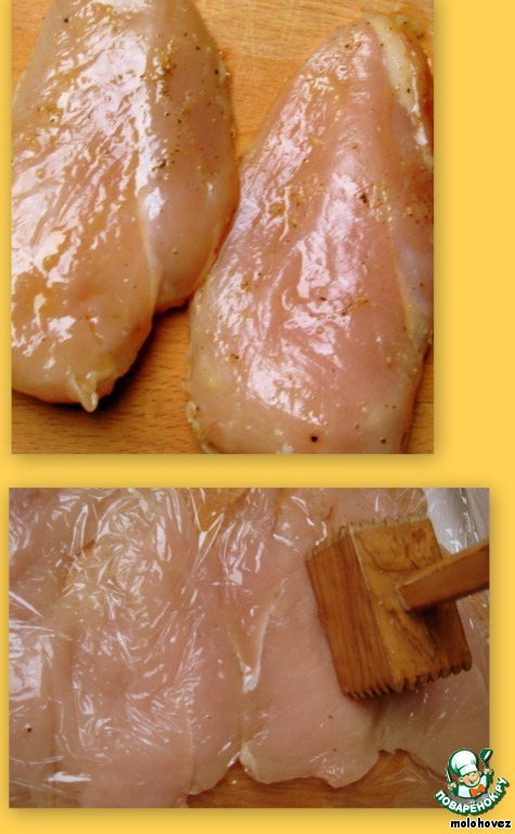 Каждую куриную грудку разрезать аккуратно пополам с более толстой стороны. Разложить между двумя слоями полиэтилена и отбить тупой стороной молотка.