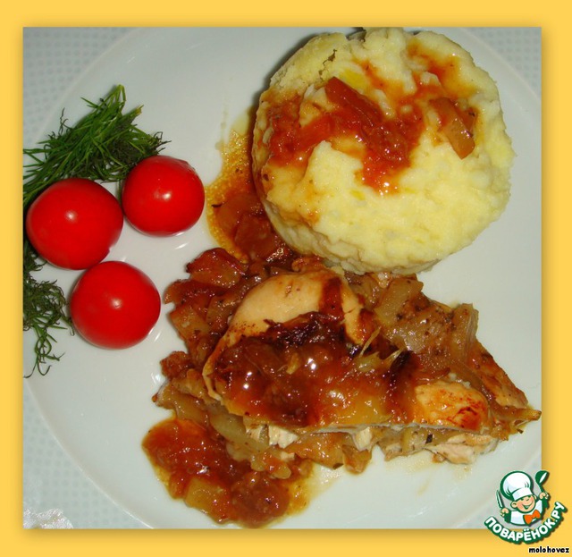 Нарезать порционно острым ножом. Подавать с картофельным пюре, полив образовавшимся соусом!