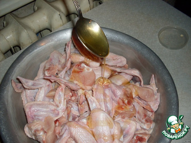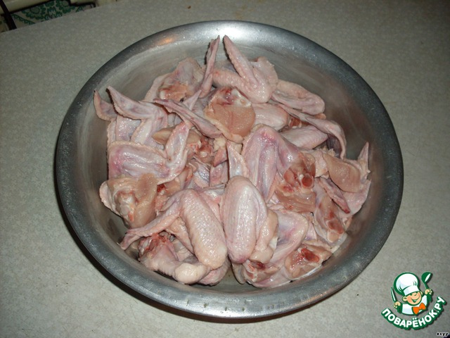 Промыть куриные крылышки и очистить их от остатков перьев.