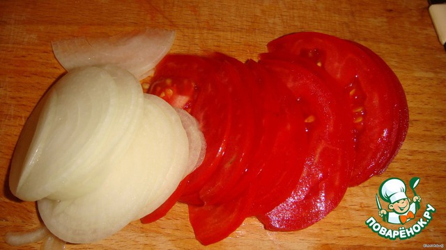 Помидор нарезаем тонкими полукольцами, лук тоненькими колечками.