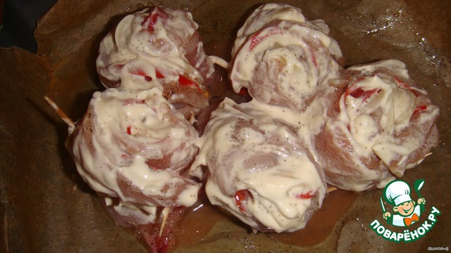Сверху намазываем майонезом и ставим в разогретую духовку на 25 минут.