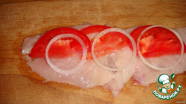 Мясо надо укладывать внахлёст, отбивные слегка солим, перчим. На филе сверху кладем помидоры и лук.