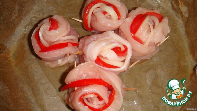 Заворачиваем наши розочки и скрепляем зубочистками.