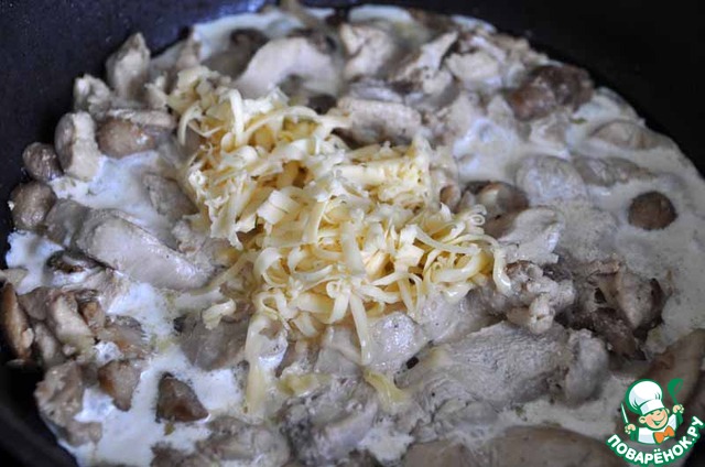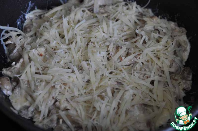 Наливаем сливки, добавляем натёртый твёрдый сыр (лучше "чеддер"), всё перемешиваем, огонь отключаем.