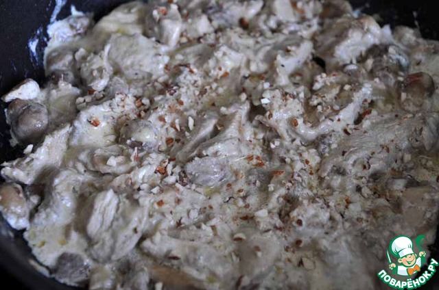 Посыпаем измельчённым миндалём куриное филе с грибами.