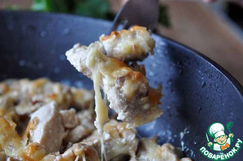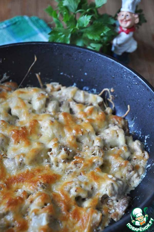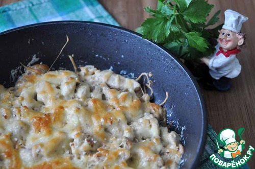 Ставим в нагретую до 250 градусов духовку на верхний ярус сковороду, на 10 минут для расплавления и запекания сыра.