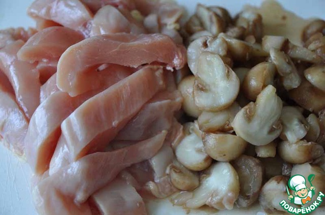 Куриную грудку (филе) нарезаем толстыми полосками.