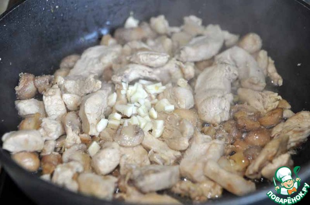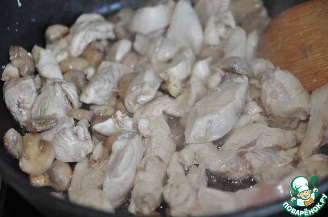 Добавляем куриное филе, обжариваем до подрумянивания 5 минут.