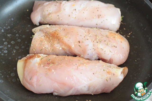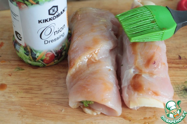 Куриное филе разрезать вдоль и отбить под пленкой с одной стороны. Смазать филе луковым соусом от Киккоман.