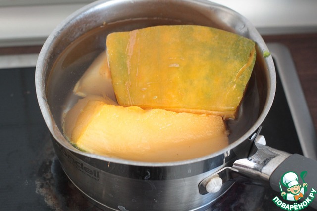 Пока готовится курица, приготовим гарнир. Тыкву разрежем, положим в кастрюлю и доведем до кипения.
