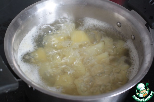 Картофель почистим, нарежем кубиками и отварим до готовности.