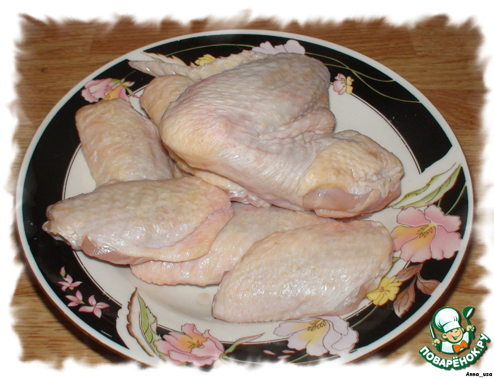 Куриные крылышки помыть, разделить на 2 части (можно и целиком, кто как любит), посолить, поперчить по вкусу.