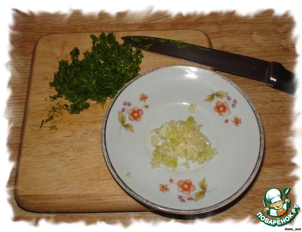 Укроп помыть, обсушить и мелко нарезать. Чеснок выдавить или мелко нарубить.