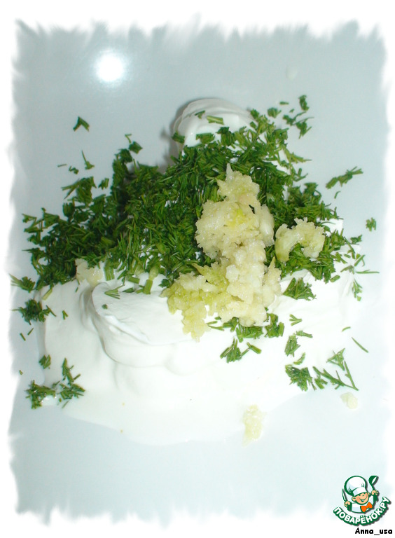 В отдельной посуде смешать сметану, укроп и чеснок, можно чуть-чуть посолить.