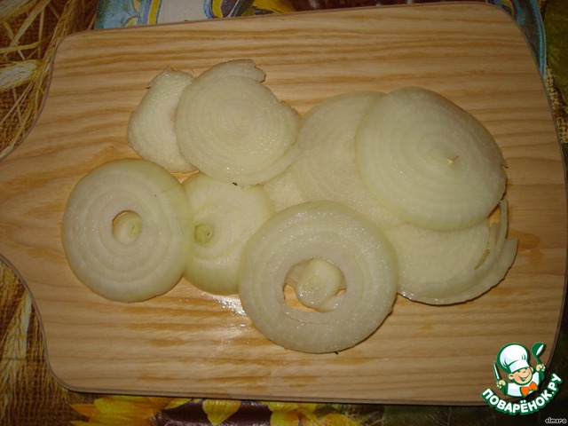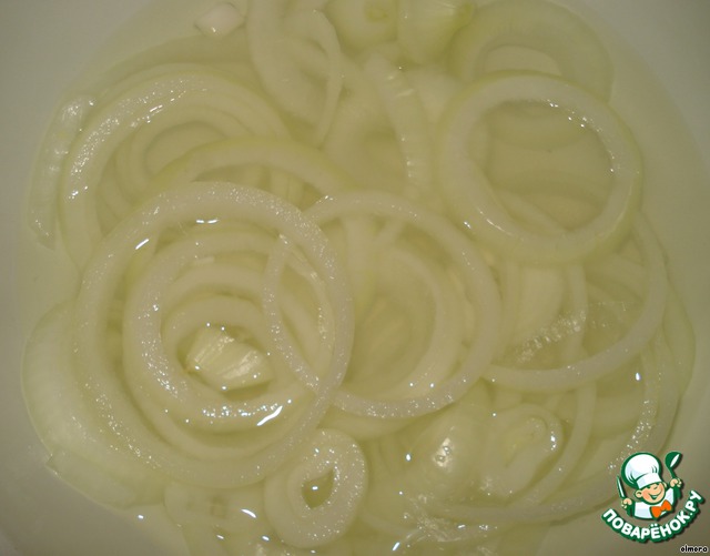 Для начала займемся луком, так как необходимо будет его замариновать. Луковицу очищаем и режем кольцами.