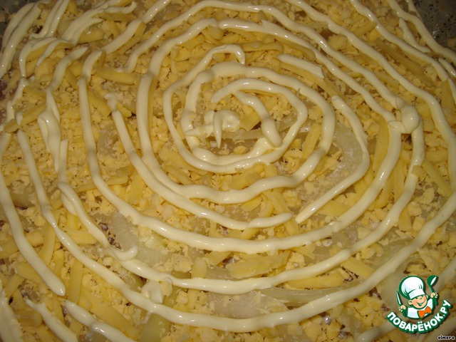 Далее укладываем лук (перед этим сливаем воду из миски с луком), а затем сыр.