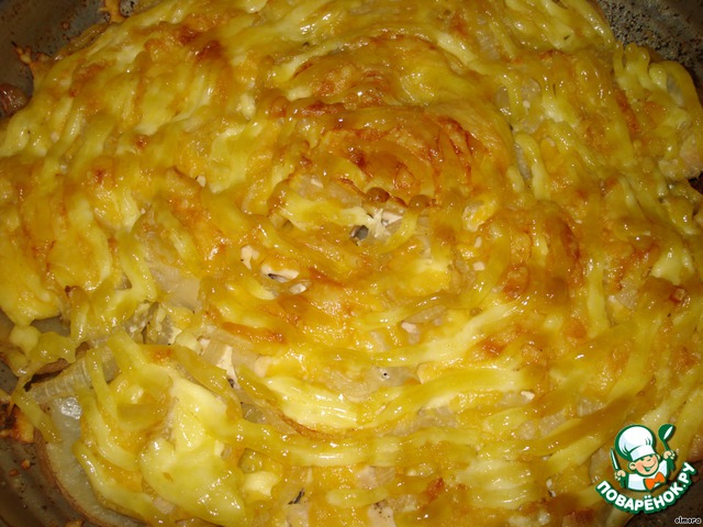 Поставить противень в духовку, сделать огонь поменьше и готовить около 40 минут, пока сыр с майонезом не получат золотистый цвет.