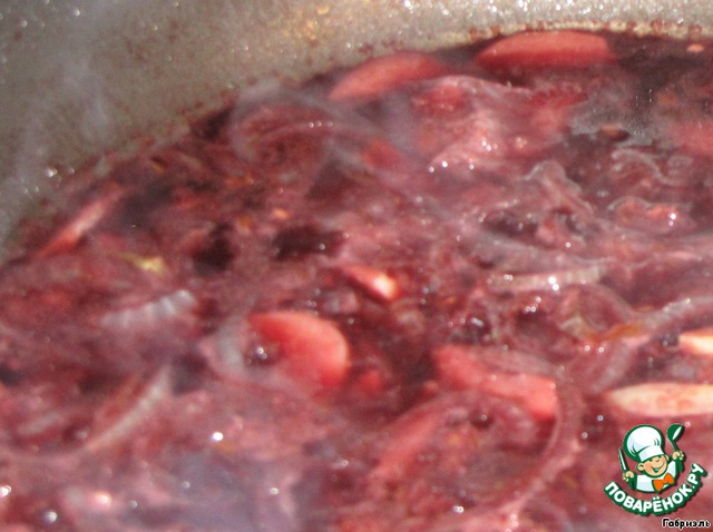 Накрываем крышкой (у моей формы крышка не предусмотрена, я накрывала фольгой) и отправляем в разогретую до 180 градусов духовку, примерно, на час-полтора. По возможности, периодически, поливаем соусом. (В этот раз я не поливала, было неудобно открывать и закрывать фольгу.)