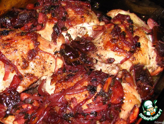 Курицу обмазать смесью перцев, немного посолить и обжарить на раскаленной сковороде в небольшом количестве масла с двух сторон до золотистой корочки. Кусочки выложить в жаропрочную посуду, в которой потом будем запекать.