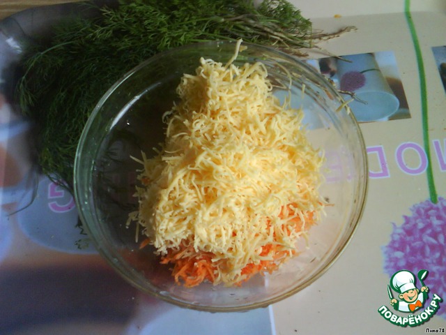 Морковь почистить,яблоко очистить от кожуры и семечек,натереть на мелкой терке.Сыр натереть на крупной терке,все перемешать..