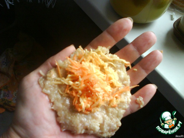 Из фарша сделать лепешки,положить внутрь сырно-овощную массу и придать изделиям форму котлеты.