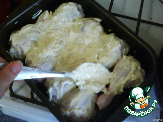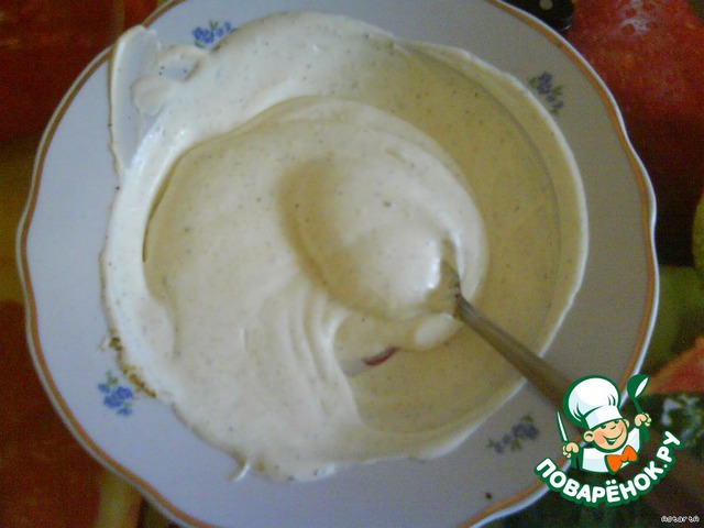 Тем временем, в тарелке смешать майонез и сметану (я покупаю майонез в пластиковых обычных упаковках, а сметану - в маленьких банках по 100-150г.). Добавить соль, специи. Соус должен получиться насыщенным и слегка приторным по вкусу.