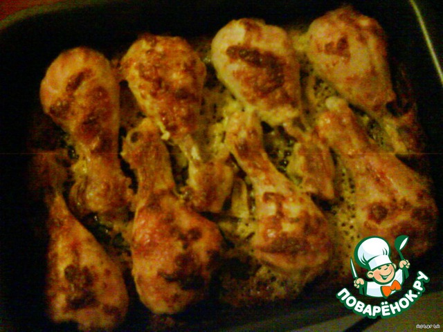 Натереть сыр на крупной терке, добавить в соус и перемешать. Куриные ножки тщательно промыть под холодной водой. Форму для выпекания смазать оливковым маслом. Выкладывать ножки в форму для выпекания, предварительно смазав соусом. Остатки соуса выложить ложкой. Между ножками положить кусочки долек чеснока. Поставить в духовку на 35 минут до появления румяной корочки.