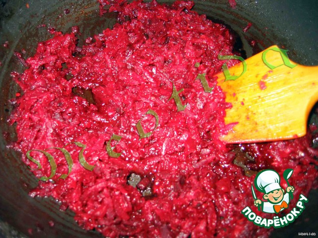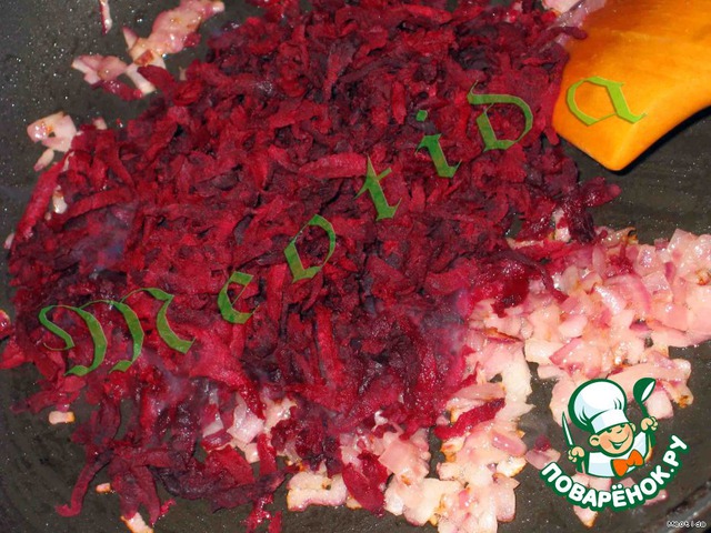 Свеклу чистим и трем на крупной терке, добавляем к луку и обжариваем, постоянно помешивая, минут 5-7.