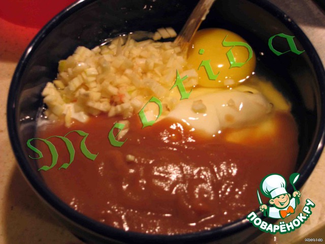 Чесночок измельчаем ножом и смешиваем со сметанкой, яйцом и яблочным пюре. Все это слегка взбиваем венчиком.