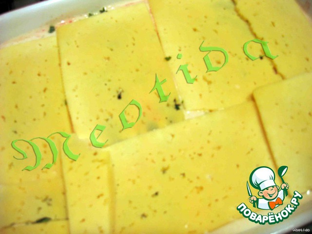 Сверху выкладываем тоненькие пластинки сыра или можно сыр потереть на крупной терке.