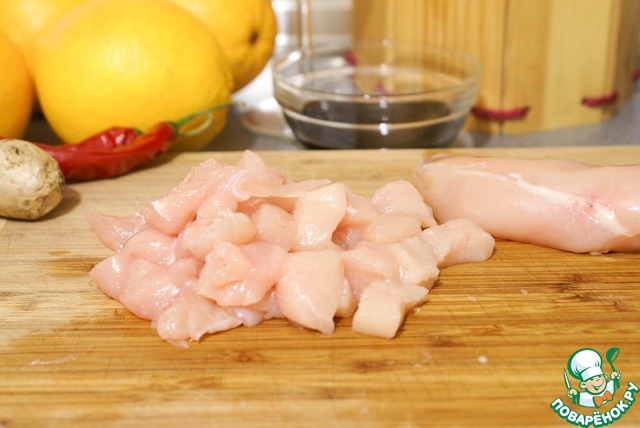 Куриное филе замариновать в 100г соевого соуса, добавив измельченные специи, мелко натертые имбирь и чеснок и (по желанию) перец чили (хлопья или свежий мелко нарезанный). Отставить филе мариноваться.