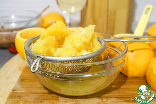 Поступить таким образом со всеми апельсинами, собирая мякоть в отдельную емкость. После чего отделить сок, протерев или процедив полученную массу через сито.