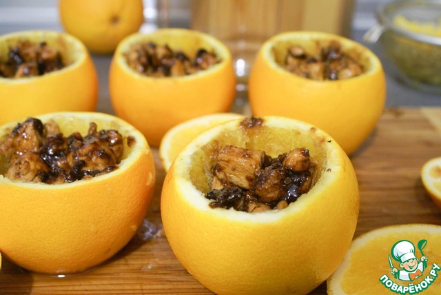 Кусочками курицы вместе с соусом начинить апельсины и накрыть их "крышечками".